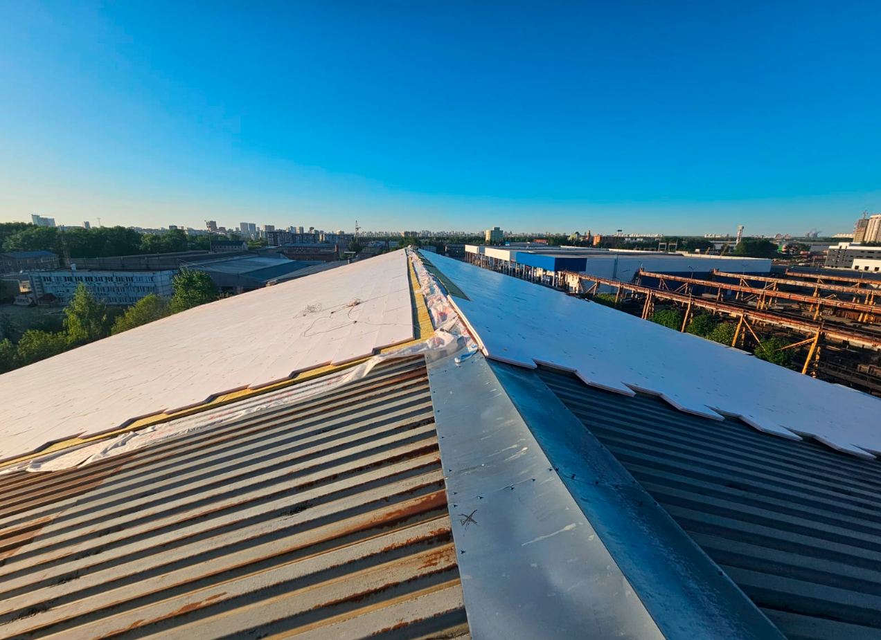 Ремонт кровель, выполненных из профлиста и сэндвич-панелей. При помощи пеноплекса, разделительного слоя и ПВХ/ТПО мембран